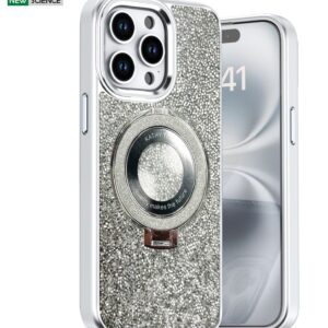 Add sparkle and essential functionality to your iPhone 17. This protective case features a dazzling glitter finish and an integrated, rotating MagSafe-compatible metal ring. Use the ring for a secure grip or fold it out as a convenient kickstand for hands-free viewing. Available in multiple colors.