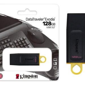 The Kingston DataTraveler Exodia (128GB) offers reliable storage with high-speed performance via USB 3.2 Gen 1 (backward compatible with USB 2.0). Features a stylish black and yellow design with a protective cap and a large loop for keyrings. Ideal for fast transfers of documents, photos, and large video files.