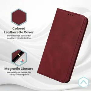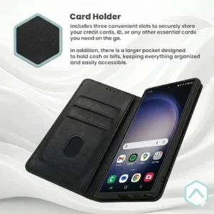 Protect your Samsung Galaxy S26 Plus with this premium faux leather flip cover. Featuring a built-in card holder, secure magnetic closure, and a convenient hands-free kickstand, it combines sophisticated style with 360-degree defense. Available in Black, Navy Blue, Brown, and Red.