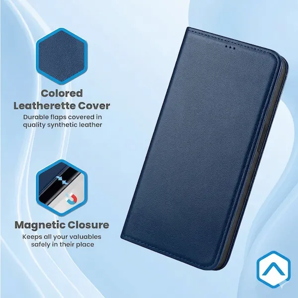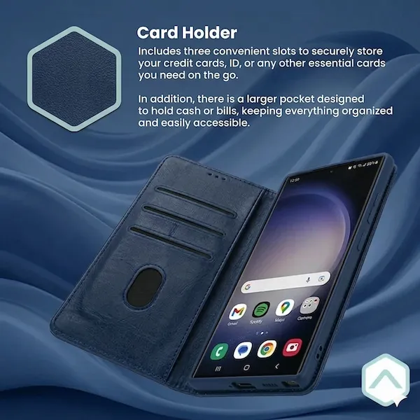 Protect your Samsung Galaxy S26 Plus with this premium faux leather flip cover. Featuring a built-in card holder, secure magnetic closure, and a convenient hands-free kickstand, it combines sophisticated style with 360-degree defense. Available in Black, Navy Blue, Brown, and Red.